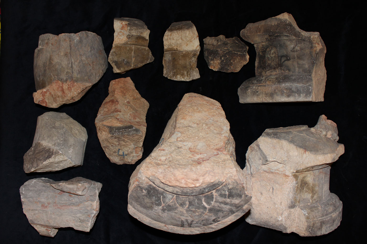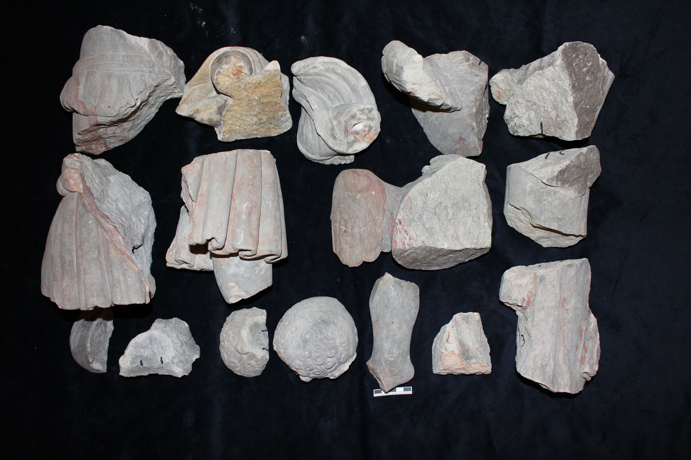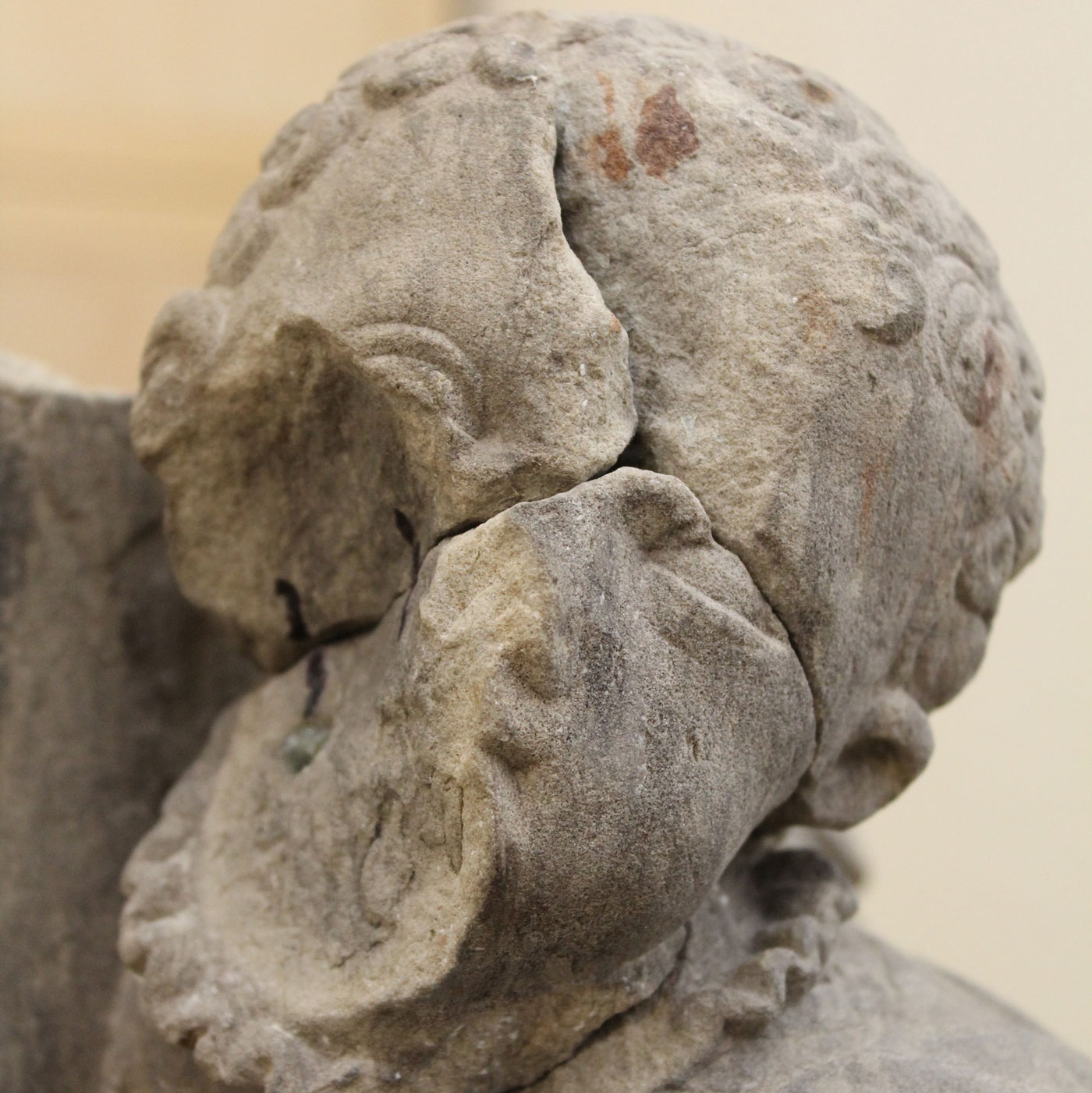Aus ästhetischen und konservatorischen Gründen mussten die Gipsergänzungen vollständig entfernt und die mit Versatz verklebten Bruchstücke voneinander getrennt werden. Die Bruchstücke wurden nach der Steinfestigung zusammen gefügt und punktuell mit Epoxidharz verklebt. Durch die großen Fehlstellen im Säulenbereich war es aus statisch-konstruktiven Gründen notwendig, Gewindestäbe von 5-10 mm Durchmesser einzusetzen und mit Epoxidharz in die Bohrlöcher einzukleben. Um die tiefen Ausbrüche in Säulenschaft und Säulenbasis zu schließen, erfolgte zur Stabilisierung zunächst ein mehrschichtiger Auftrag mit dem Grundiermörtel, der Oberflächenbereich wurde mit einem in der Struktur an das Originalgestein angepassten Steinergänzungsmörtel geschlossen.