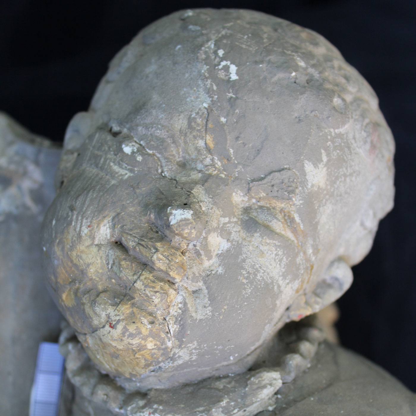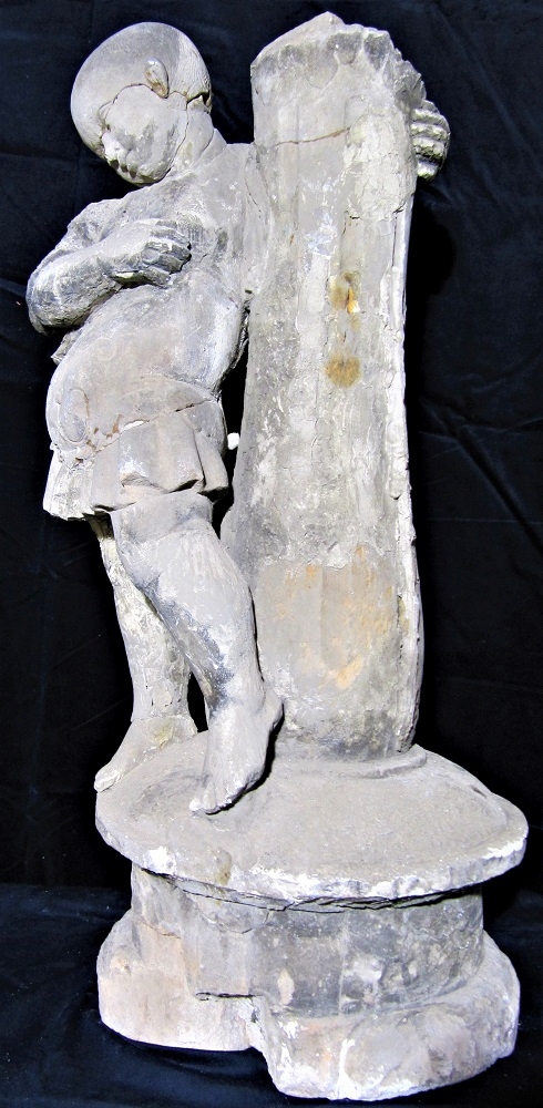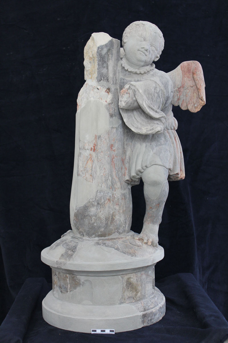 Die beiden noch vorhandenen der ursprünglich vier Trägerfiguren der Altarmensa wurden 1945 zerstört und in den 1950er- Jahren provisorisch zusammen gesetzt und mit Gips ergänzt, als Vorlage für eine Sandsteinkopie.